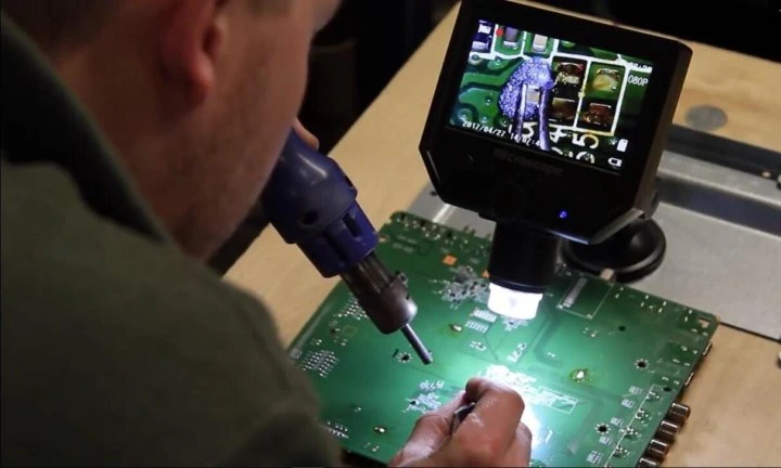 Наличие микроскопа позволяет значительно ускорить работу, поскольку у техники есть возможность оперативно увидеть, если какая-то деталь была установлена неправильно, или если пайка была выполнена с ошибками.