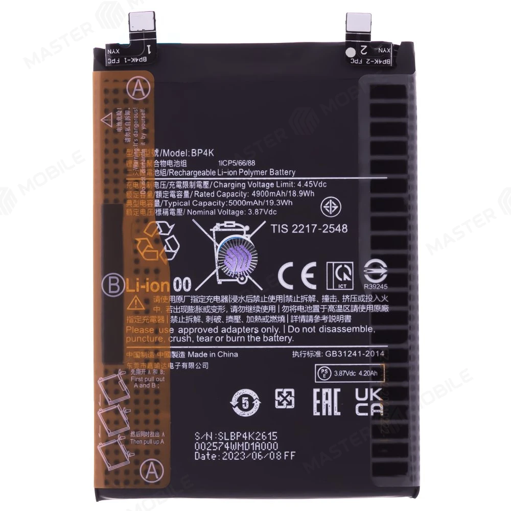 Качественные запчасти для смартфонов по лучшим ценам. Интернет-магазин MASTER MOBILE предлагает купить Аккумулятор для Xiaomi Redmi Note 12 Pro 4G (2209116AG) / Redmi Note 12 Pro 5G (22101316G) / Poco X5 Pro 5G (22101320G) / Poco F5 (23049PCD8G) (BP4K) по цене 990 руб. для замены неработающей батареи смартфона. Аккумулятор целиком совместим с моделью устройства, указанной в характеристиках. Огромный выбор аккумуляторов и других запчастей в каталоге MASTER MOBILE.