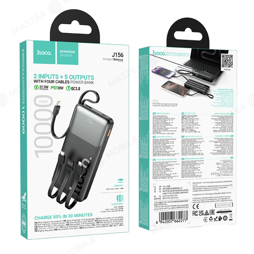 Характеристики Внешний накопитель Hoco J156 10000 mAh с кабелями TypeC + MicroUSB + USB+ Lightning (черный)